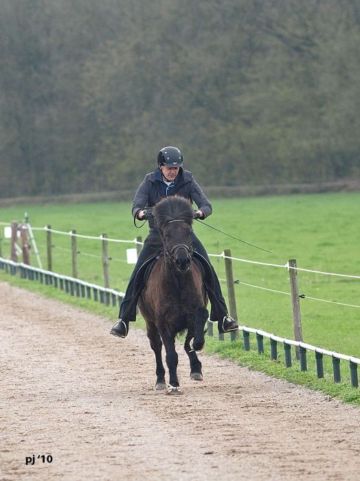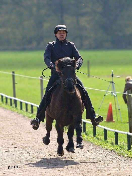 In dit geval was Fylkir uitgeleend aan Séverine Thomas om te starten in V3 en T5. Séverine is een Duitse jeugdruiter die afgelopen winter voor ons Ásti heeft doorgereden en daardoor ook regelmatig bij ons heeft vertoefd. Tijdens zo’n avond is dit plan geboren. De start was zeker niet onverdienstelijk en met een score boven 6 pt. werd een eerste plaats in de V3 zeker gesteld. Op zaterdag stond de T5 op het programma. Door domme pech ging tijdens de proef een ijzer verloren, waardoor vroegtijdig een einde kwam aan dit optreden. Jammer, maar dat hoort er ook bij! Gelukkig was Ralf Wohllaib ter plekke die snel de schade kon herstellen, Fylkir stond binnen een half uur weer keurig beslagen in zijn prikwei, preventief natuurlijk benen behandeld, maar op zondag kon zonder kleurscheuren de V3-finale gereden worden die met overmacht gewonnen werd. Wij feliciteren Séverine van harte met dit resultaat. (Owh ja, even een tussentijds commentaar voor Sévi, je halster komt nog mee naar Basselthof binnenkort, hing nog bij ons in de trailer – just kidding)..